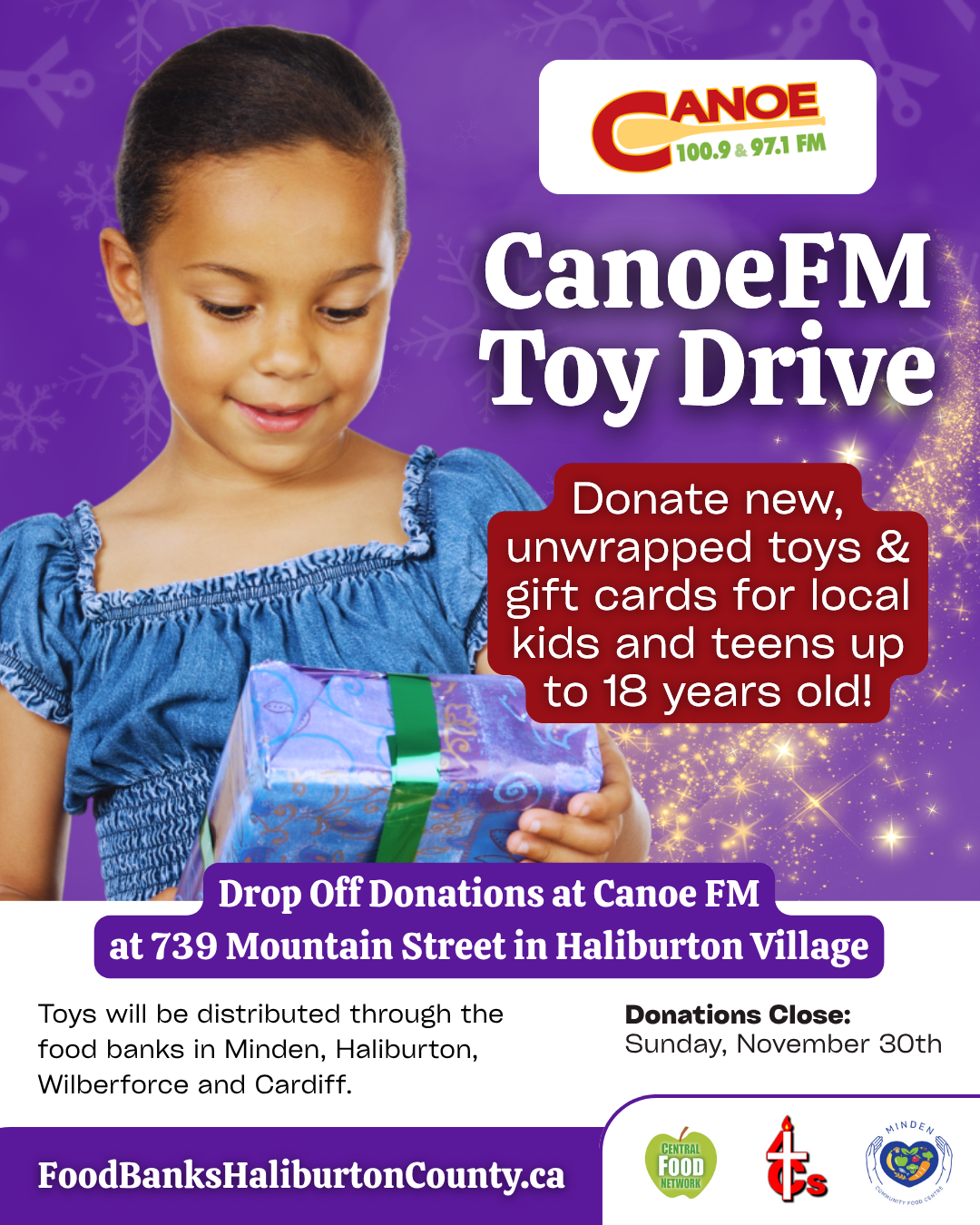 This holiday season, CanoeFM is partnering with the Haliburton County Food Banks — including the Minden Community Food Centre — to collect toys and gift cards for local children and teens in Minden, Haliburton, Wilberforce, and Cardiff.